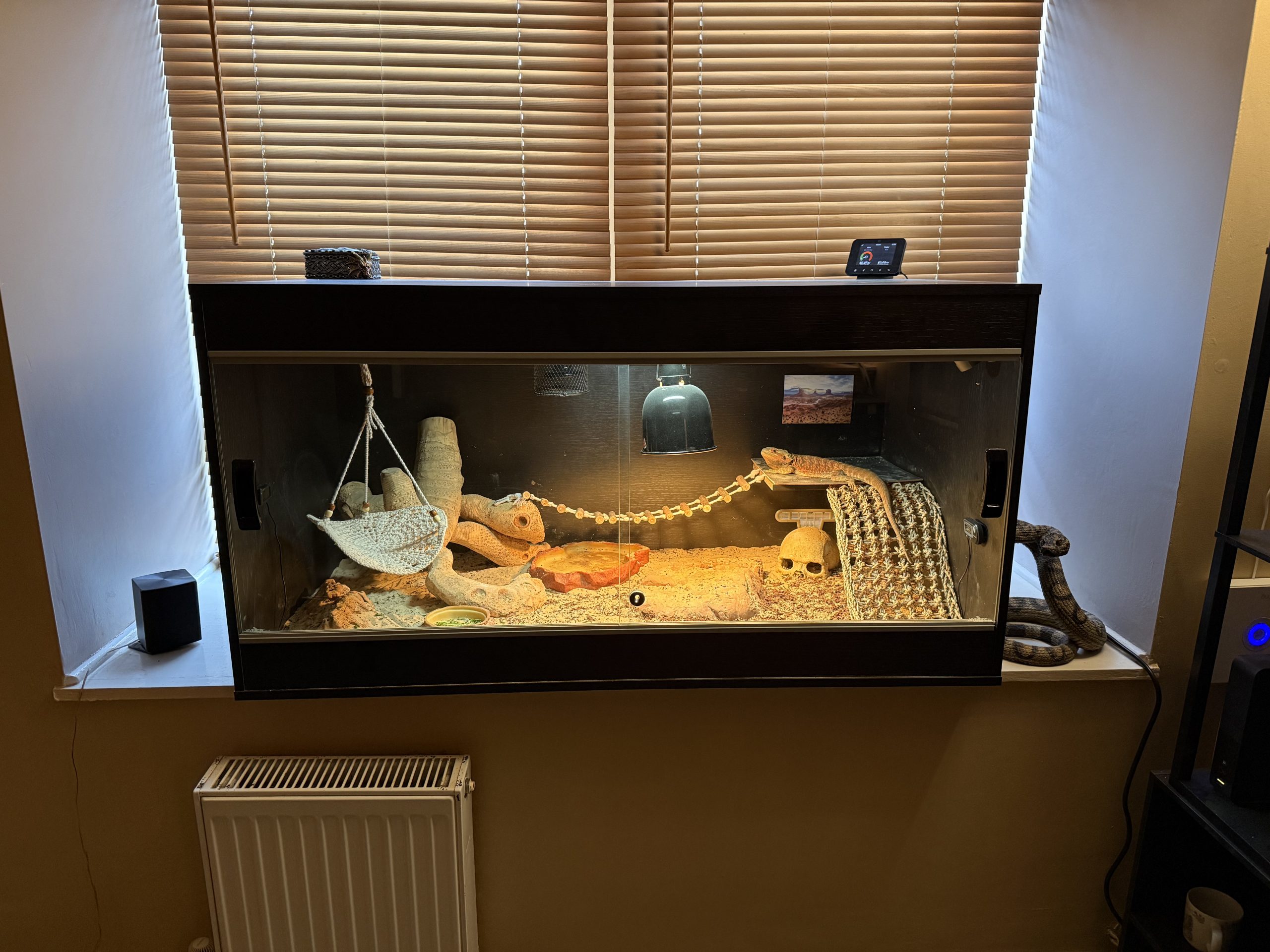 Bearded Dragon & Vivarium/Full Equipment and extras. Very sad to sell, but moving abroad to somewhere not big enough to house him. His name is Ignis; he’s happy and healthy and loves to cuddle up in the evenings, always excited to explore and enjoys baths!